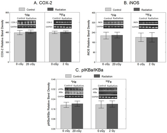 To assess the effects of 4He and 56Fe on inflammation, we quantified the protein levels of COX-2 and iNOS, intracellular enzymes responsible for producing pro-inflammatory prostaglandins [23] and nitric oxide (NO) [7]. Additionally, we quantified protein levels of pIκB-α, an indicator of increased activation of NF-κB, a transcription factor responsible for inducing the expression of inflammatory genes such as COX-2 and iNOS [23]. As shown in Figure 1, compared to non-irradiated cells, exposure to 20 cGy 4He did not have significant effects on COX-2 (F1,34 = 14, p = 0.71), iNOS (F1,34 = 0.00, p = 0.98) or pIκB-α/IκB-α (F1,34 = 0.84, p = 0.84), Similarly, 2 Gy 56Fe did not have significant effects on COX-2 (F1,34 = 0.09, p = 0.77), iNOS (F1,34 = 0.10, p = 0.75), or pIκB-α/IκB-α (F1,34 = 0.33, p = 0.57).