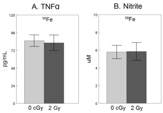 For only the experiment using 56Fe, we assessed extracellular release of NO2−, a breakdown product of free radical NO and TNFα, a pro-inflammatory cytokine [9], both hallmarks of microglial activation [8,24]. As shown in Figure 2, compared to non-irradiated cells, exposure to 2 Gy 56Fe did not have significant effects on NO2− (F1,34 = 0.18, p = 0.68), or TNFα (F1,34 = 0.07, p = 0.79).
