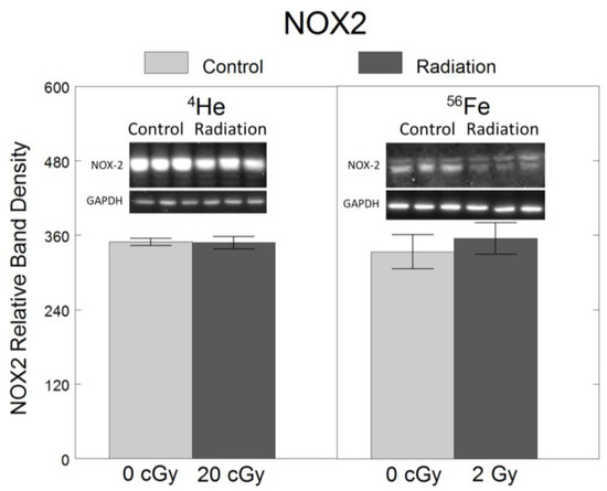 To assess the effects of 4He and 56Fe on oxidative stress, we quantified the protein levels of NOX2, a ROS-generating enzyme in microglia [6,7]. Relative to non-irradiated controls, no significant changes in NOX2 were observed following exposure to 20 cGy 4He (F1,34 = 0.005, p = 0.94) or 2 Gy 56Fe (F1,34 = 0.22, p = 0.64) (Figure 3).
