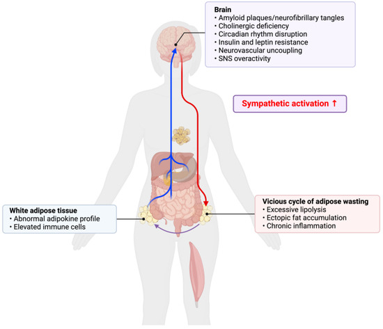 While weight loss is a natural outcome of biological aging, excessive weight loss serves as a clinical manifestation of AD [29]. The weight loss seen in AD is attributed to multiple factors, including lower energy intake and higher resting energy expenditure [30]. Patients diagnosed with mild cognitive impairment (MCI) who experience weight loss have an elevated risk of developing AD [31]. Similarly, individuals with AD who undergo weight loss are at a heightened risk of disease progression, leading to increased morbidity and mortality [32]. There is a positive association between cognitive performance and sarcopenic obesity in older adults with AD [33]. The occurrence of late-life weight loss precedes the onset of cognitive decline in AD [34,35]. An association between late-life weight loss and the development of MCI is found independent of midlife body weight [36]. Interestingly, recent data suggest that both substantial late-life weight gain and weight loss are associated with a higher risk of dementia [37]. Hence, it is plausible that significant shifts in either direction of the body weight set point leads to a decline in brain health due to improper compensatory mechanisms. This raises the questions of whether an altered adipose tissue milieu precedes cognitive decline in both biological and pathological aging, and what are the peripheral messengers involved in the brain–body crosstalk to mediate this shift. One possible explanation that connects the systemic alterations seen in AD is dysautonomia, a state of autonomic nervous system dysfunction [38]. AD is characterized by cholinergic dysfunction, resulting in a chronic state of neuronal hyperactivity [39]. Levels of cholinergic receptor binding are inversely associated with the severity of dementia [40]. Excess sympathetic tone results in an overall catabolic state. For example, increased sympathetic innervation to the WAT leads to elevated lipolysis, with elevated free fatty acids resulting in ectopic accumulation of lipids and contributing to a chronic inflammatory state (Figure 1). This explains the generalizing wasting syndrome associated with AD [41]. The miscommunication between the brain and adipose tissue, resulting in autonomic dysfunction, is also reported in cancer-associated cachexia [42]. Further investigation into the somatosensory innervation of adipose tissue can assist in elucidation of the neuro-adipose crosstalk in health and disease [43] Though late-life BMI is inversely correlated with AD risk, future studies comparing late-life weight maintenance and weight gain are needed to assess the therapeutic efficacy of late-life overnutrition. Whether midlife weight gain or late-life weight loss is a greater risk factor to higher morbidity and mortality of neurological disorders needs clarification.