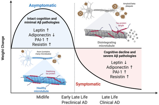 Alzheimer’s stages in the context of adipokines. The transition from midlife to late life leads to weight loss and alterations in the structure and function of adipose tissue. This leads to an altered adipose tissue secretome, resulting in a pathological adipokine profile that enhances AD pathology. Figure created using Biorender.