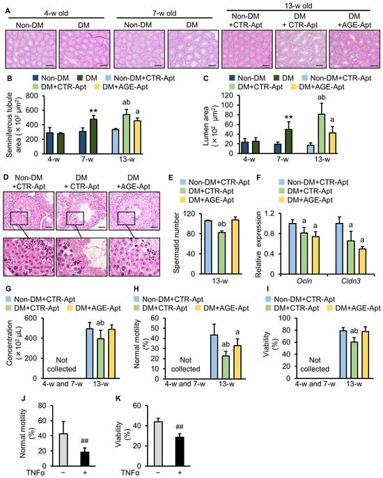 2.2. AGE-Apt Attenuated Seminiferous Tubular Dilation and Sperm Abnormalities in Diabetic Mice