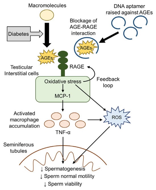 Mori, Y.; Terasaki, M.; Osaka, N.; Fujikawa, T.; Yashima, H.; Saito, T.; Kataoka, Y.; Ohara, M.; Higashimoto, Y.; Matsui, T.; et al. DNA Aptamer Raised against Advanced Glycation End Products Improves Sperm Concentration, Motility, and Viability by Suppressing Receptors for Advanced Glycation End Product-Induced Oxidative Stress and Inflammation in the Testes of Diabetic Mice. Int. J. Mol. Sci. 2024, 25, 5947. https://doi.org/10.3390/ijms25115947