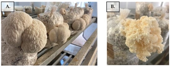 Controlled cultivation of Hericium erinaceus (A) and Hericium coralloides (B) at Pereman’s laboratory facilities—Migal.