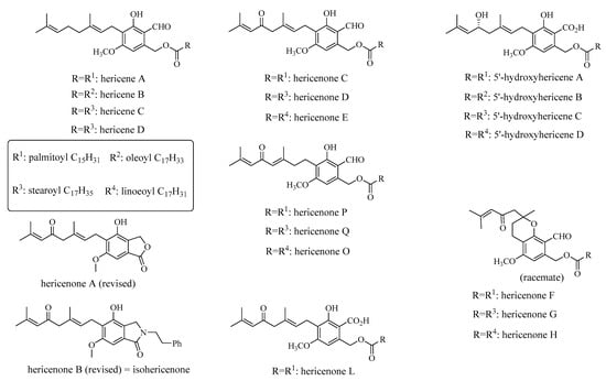 Chemical structures of selected hericene and hericenone derivatives.