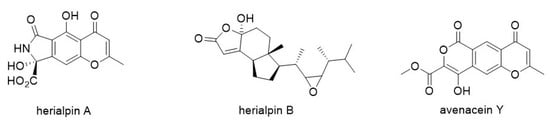 Li et al. described the isolation and structural determination of three new compounds derived from Hericium alpestre, known as herialpins A–B, and avenacein (Figure 9). The compounds were purified using medium-pressure chromatography over RP-18, followed by Sephadex LH-20, yielding 3.2 mg, 1.8 mg, and 2.1 mg from 2.9 g methanolic extract of fermented culture of H. alpestre, respectively. The structures were elucidated by 1D- and 2D-NMR data, ESI-MS, and X-ray crystallographic analysis [].