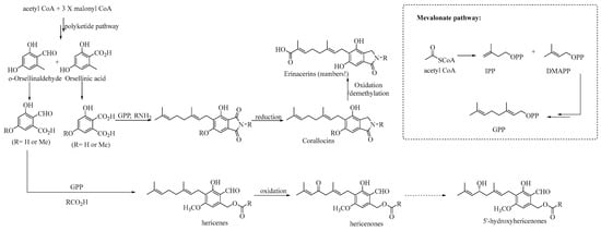 The biosynthesis pathway of geranyl-resorcinol-type metabolites is thought to be generated from malonyl CoA and acetyl CoA through the hybrid polyketide-mevalonate pathways []. Orsellinic acid and o-orsellinaldehyde are proposed to be biosynthesized from the acetyl malonyl pathway, while geranyl pyrophosphate (GPP, C10) is produced from isopentyl pyrophosphate (IPP) and dimethylallyl pyrophosphate (DMAPP). Orsellinic acid and o-orsellinaldehyde are then suggested to undergo o-methylation and benzylic oxidation. Subsequently, both intermediates are assumed to undergo geranylation with GPP, along with either an amino acid or a fatty acid to produce isoindoline 1,3-dione and hericenes, respectively. Furthermore, hericenes may undergo oxidative metabolism on the geranyl side chain to produce hericenones, which may be followed by reductive metabolism to produce hydroxyhericenone. On the other hand, isoindoline 1,3-dione derivatives are transformed into corallocins (isoindoline derivatives) through reduction, followed by oxidation to produce erinacerin derivatives (Scheme 1) [,,].
