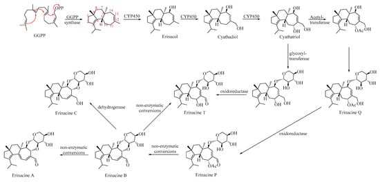 Erinacines belong to the terpenoid family of natural products, derived from two 5-carbon precursors: IPP and DMAPP. These precursors undergo condensation head to tail under the action of isoprenyl diphosphate synthase, resulting in the formation of geranylgeranyl diphosphate (GGPP, C20), which cyclizes to form the cyathane 3,12-diene backbone (C20). For more detailed information about the transcriptome analysis and involved genes in biosynthesis, please refer to the cited publications [,,,]. Cytochrome P450 enzymes (CYPs) then sequentially hydroxylate C14, the methyl group of C12, and C11 to form cyathatriol. C11 of cyathatriol is subsequently acylated to form 11-O-acetyl cyathatriol, which is then catalyzed by xylosyltransferase to cyathane xyloside, known as erinacine Q. Afterwards, oxidoreductase catalyzes the conversion to erinacine P, which may undergo non-enzymatic conversion to form erinacine B, A, T, and C []. Alternatively, cyathatriol may undergo a glycosyltransferase reaction followed by an oxidoreductase reaction to produce erinacine T (Scheme 2) [].