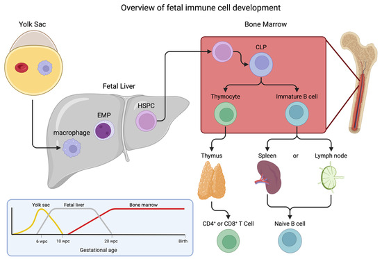 - Kobayashi, M.; Yoshimoto, M. Multiple waves of fetal-derived immune cells constitute adult immune system. Immunol. Rev. 2023, 315, 11–30. [Google Scholar] [CrossRef] [PubMed]