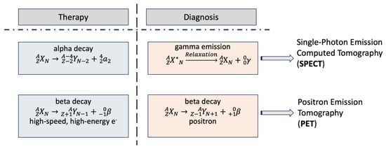 The differential properties of radionuclides used in nuclear medicine for either Positron Emission Tomography (PET) or Single-Photon Emission Computed Tomography (SPECT). Radionuclides that decay to alpha and beta (electron emission, e−) particles are used for radiotherapy, while those which undergo gamma emission and beta decay (positron emission, e+) are used for radiodiagnosis [,]. Abbreviations: PET: Positron Emission Tomography, SPECT: Single-Photon Emission Computed Tomography, A: Mass number, e−: Electron, N: Number of neutrons, X: Parent nucleus, X*: Excited nuclear state of parent nucleus, Y: Daughter nucleus, Z: Atomic number, α: Alpha particle, β: Beta particle, γ: Gamma radiation.