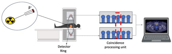 Positron Emission Tomography scan process. The two photons emitted at an angle of 180 degrees are detected at the detector ring. The pulse from the detector reaches the coincidence processing unit, which affords the position information. When an impulse is received simultaneously from two detector blocks, the detector electronics simultaneously monitor signals from each detector block and record counts (red dashed box). Abbreviation: β+: Positron.