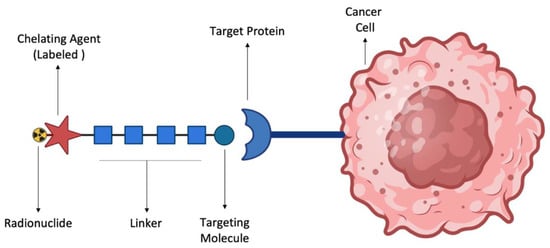 Identifying the ideal radionuclide to be employed in nuclear medicine, not only for imaging but also for therapy, is a very challenging task, as the appropriate choice is determined by several factors such as half-life, energy of emission, and radiation type. The radionuclide, in the form of a complex with a chelating molecule, must be recognized by the target to qualify for a particular application (Figure 4). The selection criteria for the appropriate radionuclide depend on its physical characteristics, such as half-life, particle emission, and gamma-ray emission, as well as production method, separation chemistry, and biological behavior [,,].
