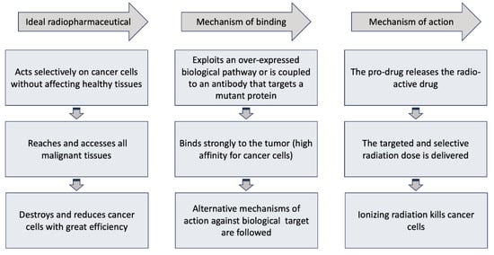The most successful radiopharmaceuticals used against cancer are those with high affinity for cancer cells and can strongly associate with the tumor but not with normal cells. There are several mechanisms of action against the drug target, as summarized in Figure 5 [,]. However, in the most common mechanisms, the pro-drug typically exploits an overexpressed biological pathway in cancer cells or is associated with an antibody that targets a mutant protein (antigen) on the surface of cancer cells, ultimately releasing the radioactive drug exclusively to these cells. Thus, these radioactive drugs selectively deliver targeted doses of radiation to tumors and their metastases, while avoiding healthy tissues []. The choice of the molecule that guides the radiation to the tumor is determined by its affinity for the target structures of the tumor, such as antigens or receptors [,,]. The ionizing radiation emitted by radionuclides associated with the directing moiety-active drug conjugate, kills cancer cells, e.g., by damaging their DNA and disrupting useful proteins, through a cascading mechanism rooted in the ionization of water molecules inside the cell, eventually causing the shrinkage of cancerous tumors [,].