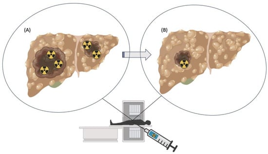 The effect of a theranostic pair in nuclear medicine, used for the simultaneous diagnosis and treatment of liver cancer. Cartoon images show liver tumors prior- (A) and post-treatment (B) with radioactive elements, in the form of a theranostic pair. The treatment results in elimination or shrinkage of tumors (B). The radioactivity symbol represents the radioisotopes used for radiotherapy and radiodiagnosis.