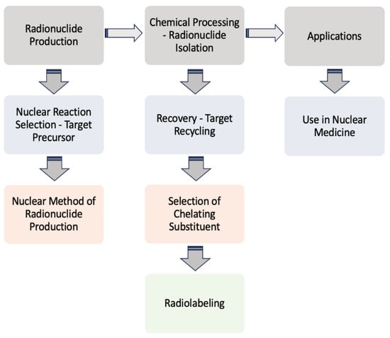 Summary of the chosen method or path from the production of the radionuclide to its use in nuclear medicine. The procedure involves initially the selection of an appropriate nuclear reaction (e.g., alpha, beta beams), the target precursor, the nuclear methods (e.g., cyclotron, generator), and, subsequently, the recovery/recycling of the target and the produced radionuclide’s isolation and conversion to a chelated complex, ready for application [,,,,].