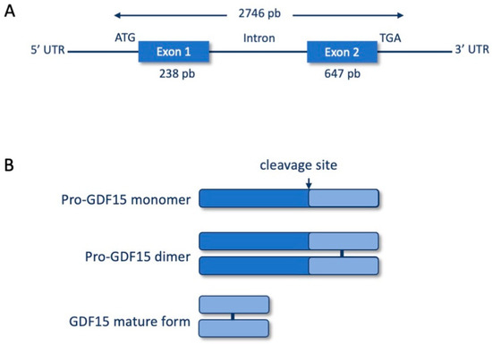 Growth Differentiation Factor 15 (GDF15) is a growth factor and cytokine secreted in response to cellular stress conditions, belonging to the TGFβ family, discovered in 1997. It is also referred to as Macrophage Inhibitory Cytokine 1 (MIC-1) due to initial studies demonstrating its ability to inhibit lipopolysaccharide-activated macrophages [1]. Subsequent studies have highlighted various functions of GDF15, leading to alternative designations such as NSAID-activated gene 1 (NAG-1), Placental Transforming Growth Factor β (PTGFB), and Prostate-Derived Factor (PDF) [2,3,4]. In humans, the gene encoding GDF15 is located on chromosome 19p12–13.1 and spans 2746 base pairs. While murine and human genes exhibit only 70% homology, they both consist of two exons separated by an intron [5] (Figure 1A). GDF15 is synthesized as an inactive pro-hormone consisting of 167 amino acids with a molecular weight of 40 kDa. It is then dimerized in the endoplasmic reticulum before being activated by cleavage at a furin-like site, resulting in the formation of a 25 kDa peptide dimer (Figure 1B). The uncleaved form of GDF15 exhibits a high affinity for the extracellular matrix, where it forms a reservoir allowing rapid secretion into circulation upon proteolysis. Only the mature form is secreted [6]. GDF15 is highly expressed in the prostate and placenta, but it is also weakly expressed in various tissues such as the kidneys, lungs, liver, intestines, colon, pancreas, and mammary gland [5,7,8]. It has also been demonstrated that GDF15 plasma concentration is increased during gestation in mice [9]. In pregnant women, the increase in GDF15 is correlated to nausea and vomiting [10]. More generally, GDF15 expression is induced in response to cellular stress, which explains why it is frequently associated with many diseases including cancer, obesity, cachexia, cardiovascular events, kidney diseases, etc. (for review see [8]).
