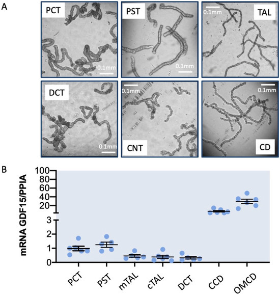 The kidney consists of nephrons that are composed of a filter, the glomerulus, and a tubular system. If the glomerulus retains the blood cells and the macromolecules, it permits the passage of small molecules (low molecular weight proteins and peptides, glucides, water …) and ions. The role of the tubular system is to reabsorb these different components through complex mechanisms. For this purpose, the tubular system is segmented and it is possible to isolate these different parts, based on their morphology, in order to study their function. Figure 2A is an example of how these segments look like with the proximal convoluted tubules (PCT), the proximal straight tubules (PST), the thick ascending limbs of the Henle loops (medullary or cortical TAL), the distal convoluted tubules (DCT), the connecting tubules (CNT, and the collecting ducts (outer medullary or cortical CD). Under physiological conditions, GDF15 mRNA is expressed by the kidney itself, although at relatively low levels, all along the tubular segments of the nephrons (Figure 2B). The use of a GFP reporter mouse strain expressing this fluorescent protein under the GDF15 promoter confirmed its expression in different tubular segments and particularly in PST and in medullary CD [35]. Investigation of GDF15KO mice under normal conditions showed that it regulates both the production of renal extracellular matrix and promotes the proliferation of tubular epithelial cells via the MAPK signaling pathway [36]. However, these GDF15KO mice do not exhibit any electrolytic perturbation under normal conditions [37,38].