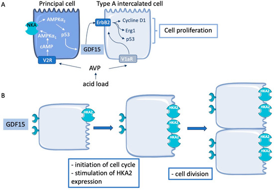 - Cheval, L.; Viollet, B.; Klein, C.; Rafael, C.; Figueres, L.; Devevre, E.; Zadigue, G.; Azroyan, A.; Crambert, G.; Vogt, B.; et al. Acidosis-induced activation of distal nephron principal cells triggers Gdf15 secretion and adaptive proliferation of intercalated cells. Acta Physiol. 2021, 232, e13661. [Google Scholar] [CrossRef] [PubMed]