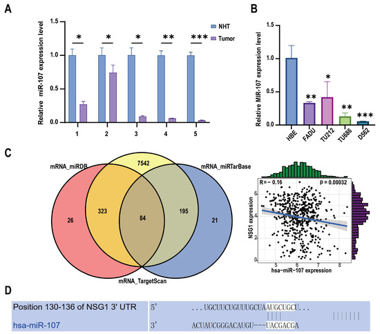 Expression levels of miR-107 in HSCC tissues and cells. (A) The relative expression levels of miR-107 in the HSCC tissues (n = 5) and adjacent tissues (n = 5) were detected using RT qPCR. (B) We detected the relative expression levels of miR-107 in the HSCC cells through RT qPCR. (C) A total of 84 predicted downstream genes were screened through the database, and the expression trends of NSG1 and miR-107 were opposite to each other. (D) The predicted binding sequence diagram of NSG1 mRNA 3′ UTR to miR-107. * p < 0.05, ** p < 0.01, *** p < 0.001. Relative expression level refers to the ratio of the expression of the target gene to the expression of the internal reference gene under the same condition. This meaning is the same in the following chart.