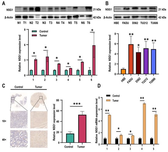 Subsequently, we assessed the NSG1 expression in the obtained cancer and adjacent non-malignant hypopharyngeal tissue through qPCR, Western blot, and immunohistochemistry. Our findings revealed a significant increase in the NSG1 expression in the HSCC tissue (Figure 2A). Furthermore, we examined the expression level of NSG1 in the HSCC cell lines using Western blot and observed a marked elevation in NSG1 expression compared with the HBE cells (Figure 2B). The relative expression levels of NSG1 in HSCC tissue (n = 6) and adjacent non-malignant hypopharyngeal tissue (n = 6) were then determined using immunohistochemical methods, confirming the high levels of the NSG1 expression in the tumor tissue (Figure 2C). Finally, an additional validation by qPCR was conducted to confirm the relative expression levels of NSG1 in the HSCC tissue (n = 6) and adjacent non-malignant hypopharyngeal tissue (n = 6), which yielded results consistent with expectations (Figure 2D).