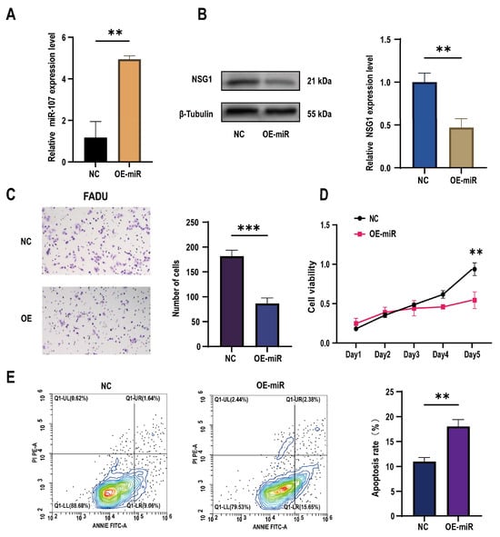 Effects of the overexpression of miR-107 on the apoptosis, proliferation, and invasion of the FaDu cells. (A) The FaDu cells were transfected with miR-107-loaded lentivirus and negative control lentivirus (NC), and RT-qPCR was used to verify the expression of miR-107 after the transfection. (B) Western blot analysis was performed to detect the expression of NSG1 in the transfected cells. (C) The invasion ability of the transversal FaDu cells was assessed by a Transwell assay (200×). (D) The proliferation of the overexpressed miR-107 cells was measured by the CCK-8 method. (E) The apoptosis of the transfected cells was detected by flow cytometry. Red means more cells; blue means fewer cells. NC group: transfected with miR-107-overexpressed lentiviral empty vector; OE-miR group: transfected with miR-107-overexpressed lentivirus. Data from three independent experiments are expressed as mean ± standard deviation. ** p < 0.01, *** p < 0.001.