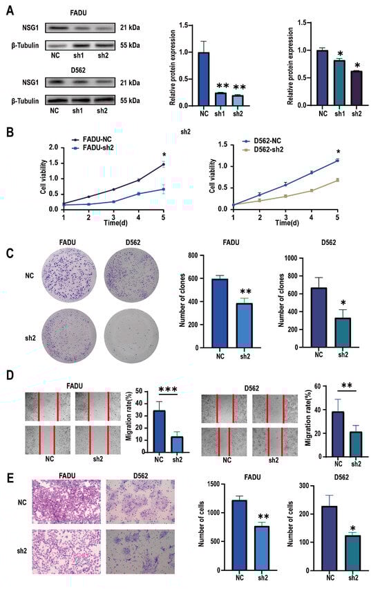 Changes in the proliferation, migration, and invasion abilities of hypopharyngeal cancer cells after downregulating NSG1 (FaDu and D562 cell lines were transfected with lentiviral vectors containing a control or knockdown NSG1 gene). (A) Western blot analysis was performed to detect the expression of NSG1 in the transfected cells. (B) The proliferation of NSG1 cells within 5 days after the knockdown was measured by the CCK-8 method. (C) The proliferation capacity of the HSCC cells was detected by the colony formation method. (D) The migration ability of transfected cells was tested by a wound scratch assay. (E) The invasion ability of the HSCC cells was evaluated by a Transwell assay. NC group: transfected with an sh-NSG1-NC plasmid; sh1 group: transfected with an sh-NSG1-1 plasmid; sh2 group: transfected with an sh-NSG1-2 plasmid. Data from three independent experiments are expressed as mean ± standard deviation. * p < 0.05, ** p < 0.01, *** p < 0.001.