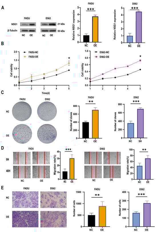 Changes in the proliferation, migration, and invasion ability of HSCC cells after the overexpression of NSG1. (A) Western blot was used to detect the expression of NSG1 in transfected cells. (B) The CCK-8 method was used to measure the proliferation of cells that overexpressed NSG1 within 5 days. (C) A colony formation assay was used to detect the proliferation ability of the NSG1-overexpressing cells. (D) We performed wound scratch experiments on the transfected cells to test their migration ability. (E) We evaluated the invasive ability of transfected cells through Transwell experiments. NC group: transfected with OE-NSG1-NC plasmid; OE group: transfected with OE-NSG1 plasmid. The data from three independent experiments are expressed as mean ± standard deviation. * p < 0.05, ** p < 0.01, *** p < 0.001.