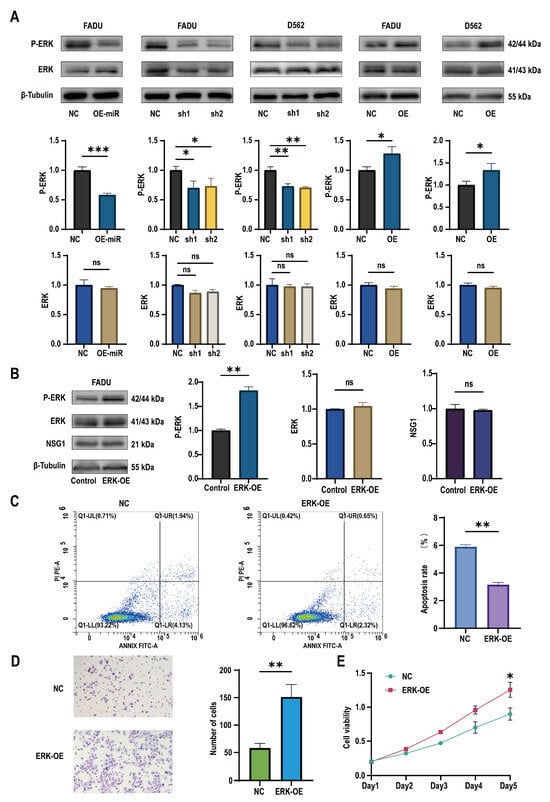 Changes in miR-107 and NSG1 affected the tumor cell phenotype through the ERK pathway. (A) Western blot was used to detect the expressions of ERK and P-ERK in the transfected cells. (B) Western blot was used to detect the expressions of ERK, P-ERK, and NSG1 in the cells after the addition of the ERK agonists. (C) Flow cytometry was used to detect the effects of the ERK agonists on cell apoptosis. Red means more cells; blue means fewer cells. (D) We evaluated the invasive ability of cells after adding the ERK agonists through Transwell experiments. (E) We measured the proliferation of cells within 5 days after the addition of the ERK pathway agonists using the CCK-8 method. The data from three independent experiments are expressed as mean ± standard deviation. NC group: blank control group; ERK-OE group: added H-Ile Lys Val Ala Val OH group. Other groups’ meanings are the same as in the above chart. ns indicates no statistical significance, * p < 0.05, ** p < 0.01, *** p < 0.001.