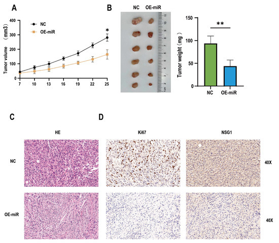 Overexpression of miR-107 inhibited the tumorigenic growth of the hypopharyngeal cancer cells in vivo. (A) The tumor volume was measured every 3 days when the tumor was visible to the naked eye. (B) On day 25, the tumors were collected and weighed. (C) HE staining of the tumor tissue. (D) Immunohistochemical staining of Ki-67 and NSG1 was performed in the tumor tissues. Scale = 50 µm. * p < 0.05, ** p < 0.01.