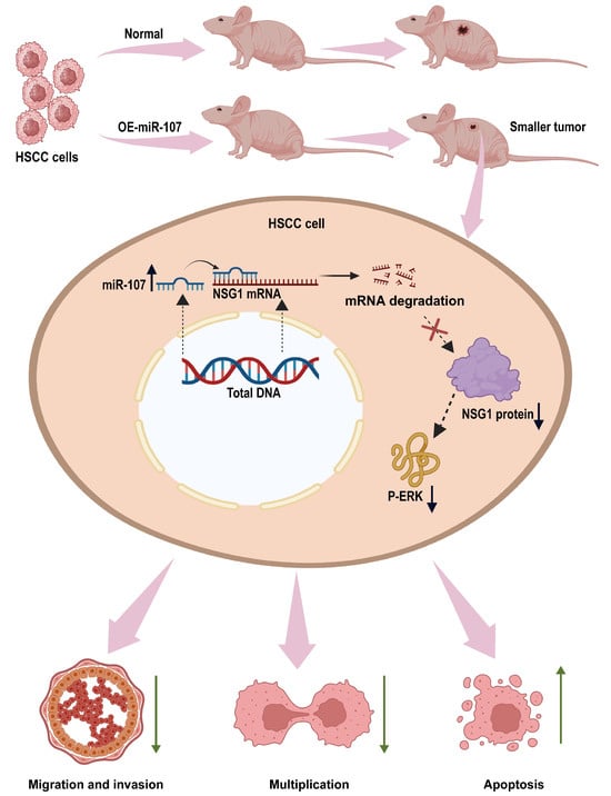 miR-107 targets the NSG1/ERK axis to regulate the HSCC cell invasion, metastasis, and proliferation. miR-107 promotes the apoptosis of HNSC cells and reduces their proliferation, migration, and invasion abilities by inhibiting the expression of NSG1, thereby inhibiting the ERK signaling pathway.
