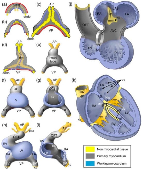 - Sizarov, A.; Ya, J.; de Boer, B.A.; Lamers, W.H.; Christoffels, V.M.; Moorman, A.F.M. Formation of the building plan of the human heart: Morphogenesis, growth, and differentiation. Circulation 2011, 123, 1125–1135. [Google Scholar] [CrossRef]
