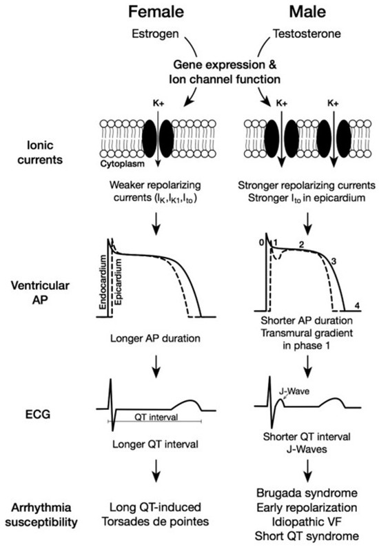 - Costa, S.; Saguner, A.M.; Gasperetti, A.; Akdis, D.; Brunckhorst, C.; Duru, F. The Link Between Sex Hormones and Susceptibility to Cardiac Arrhythmias: From Molecular Basis to Clinical Implications. Front. Cardiovasc. Med. 2021, 8, 644279. [Google Scholar] [CrossRef]