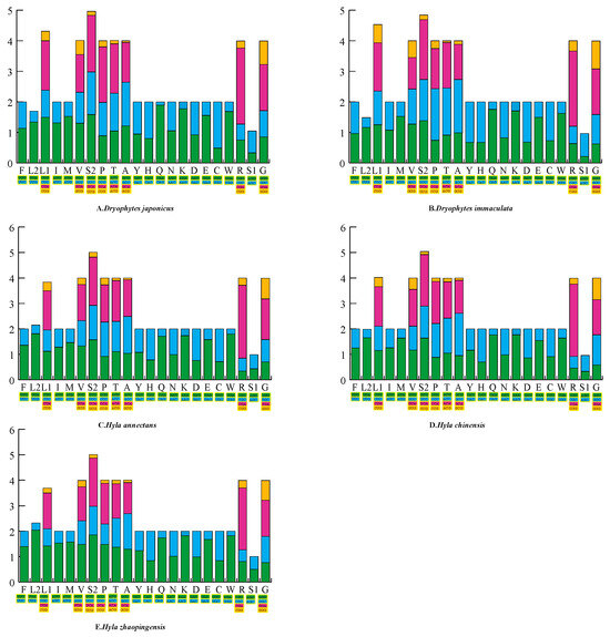 Relative synonymous codon use (RSCU) of (A) Dryophytes japonicus, (B) Dryophytes immaculata, (C) Hyla annectans, (D) Hyla chinensis and (E) Hyla zhaopingensis. All the codons used, as well as different combinations of synonymous codons, are listed on the X-axis, whereas the RSCU values are listed on the Y-axis. Different codons are represented by different colors.