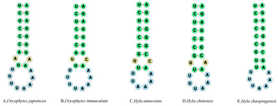The secondary structures for L-strand origin of replication (OL) for individuals of (A) Dryophytes japonicus, (B) Dryophytes immaculata, (C) Hyla annectans, (D) Hyla chinensis and (E) Hyla zhaopingensis.