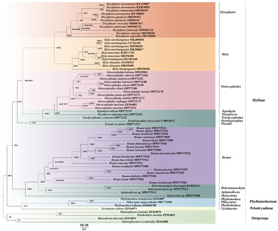 The tree results of first-, second- and third-position codon constructions are shown in Figure 3, and the tree results of the first- and second-position constructions are shown in Figures S7 and S8. We found higher confidence levels (CLs) in results using first-, second- and third-position conformational trees, and so these data were used in this study. The results from the construction of the phylogenetic trees showed that this study included three subfamilies of Hylidae, including Hylinae, Phyllomedusinae and Pelodryadinae. The results showed that Pelodryadinae and Phylomedusinae converged into one branch, and then converged with Hylidae. The phylogenetic relationship of ((((((((((Dryophytes + Hyla) + Osteocephalus) + Dryaderces) + Tepuihyla) + Trachycephalus) + (Dendropsophus + Pseudois)) + Boana) + Bokermannohyla) + Aplastofdiscus) + Hyloscirtus) appeared in the Hylinae subfamily. This research supported Dullman’s findings [58] that Hyla and Dryophytes were monophyletic, and the monophyletic nature of the Hylidae was also supported in this study.