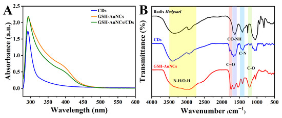 UV–vis absorbance spectra of CDs, GSH-AuNCs, and GSH-AuNCs/CDs nanohybrid (A). FT-IR spectra of Radix Hedysari, CDs, and GSH-AuNCs (B).