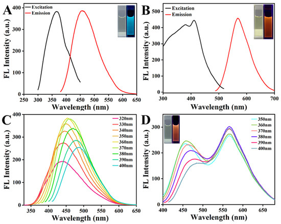 Fluorescence excitation spectra (Em = 458 nm) and emission spectra (Ex = 360 nm) of CDs (A) and fluorescence excitation spectra (Em = 569 nm) and emission spectra (Ex = 410 nm) of GSH-AuNCs (B). Fluorescence emission spectra of CDs at different excitation wavelengths (Ex = 320–400 nm) (C). Fluorescence emission spectra of GSH-AuNCs/CDs nanohybrid at different excitation wavelengths (Ex = 350–400 nm) (D). The insets showed the photographs of CDs, GSH-AuNCs, and GSH-AuNCs/CDs nanohybrid under daylight and 365 nm UV light, respectively.