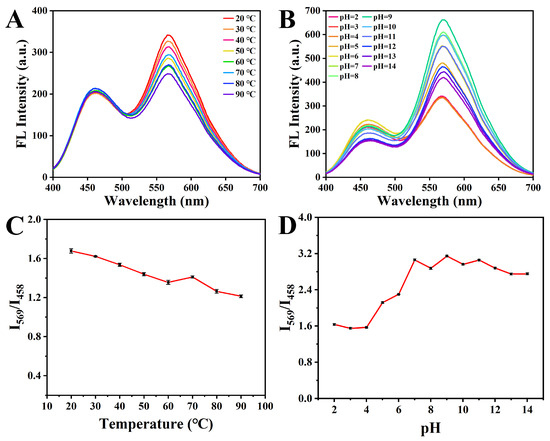 It is of great significance that we investigate the stability of the fluorescent probe for practical application. Thus, external influences such as temperature and pH were discussed in detailed. First, the influence of temperature was tested in the range of 20–90 °C. As shown in Figure 5A,C, the fluorescence intensity ratio gradually decreased with the increase in temperature. The fluorescence intensity ratio slightly decreased with the increase in temperature. In general, the I569/I458 fluorescence intensity ratio did not change significantly. Then, the influence of pH was investigated in the range of 2–14. When pH was 2–4, the I569/I458 fluorescence intensity ratio did not change obviously. However, the intensity of ratio fluorescence was significantly enhanced when the pH ranged from 5 to 14. It showed that, when the temperature of the nanohybrid was restored from 90 °C to room temperature, the fluorescence intensity recovered (Figure S4). However, when the pH was adjusted from 14 to 2, the fluorescence intensity did not fully recover (Figure S5). According to the above phenomena, 20 °C and pH 2 were selected as the optimal conditions for fluorescent probes.