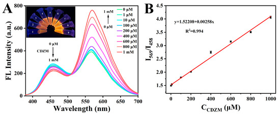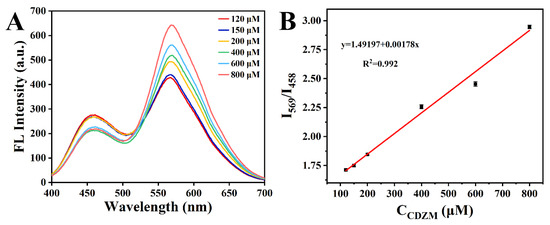 Ratio-fluorescence spectra of various concentrations of CDZM from 120 to 800 μM in urine samples (A). The linear of I569/I458 with different concentrations of CDZM in urine samples (120–800 μM) (B).