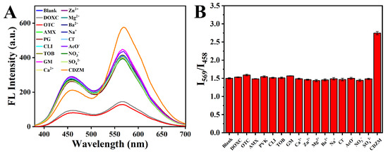 Fluorescence spectra of the fluorescent probe with the addition of the interferents and CDZM (A). The fluorescence intensity ratio after adding the interferents and CDZM (B).