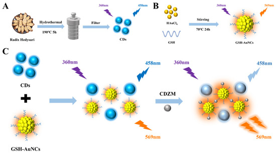 Schematic illustration of the synthesis of the CDs (A), GSH-AuNCs (B), the formation of the GSH-AuNCs/CDs nanohybrid and the sensing principle of detecting CDZM (C).