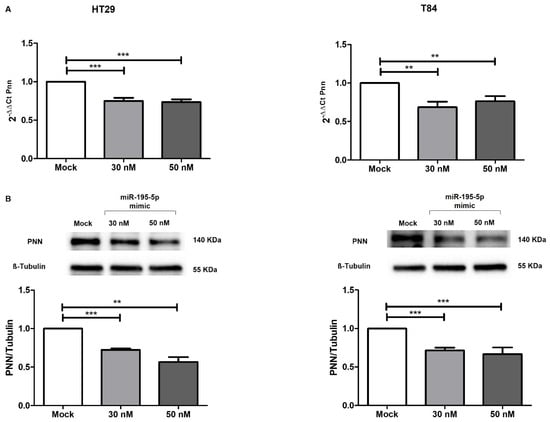 Enhancing the mature form of miR-195-5p in HT-29 and T84 cell lines, we aimed to probe whether miR-195-5p controlled PNN expression. Data obtained by real-time PCR demonstrated that the PNN mRNA expression level in transfected conditions was significantly decreased in all cell lines (p < 0.001; Figure 5A).