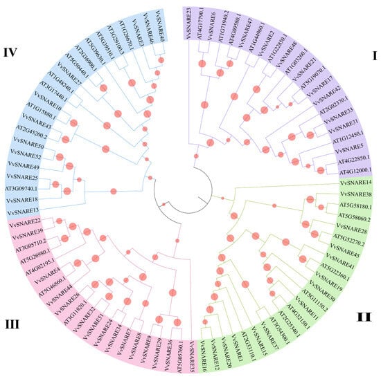 Phylogenetic analysis of the SNARE gene family in grapevine. Phylogenetic trees were constructed using the SNARE protein sequences. I–IV represent different subgroups, respectively. The NJ method was used, and the bootstrap value was set to 1000.