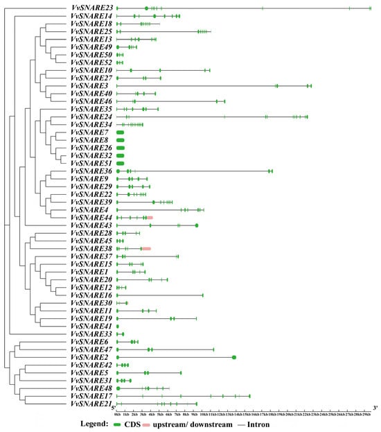 Gene structure analysis of SNARE gene family in grapevine. The exon–intron structure of VvSNARE genes. Exon CDS, upstream/downstream, and intron are indicated by the green boxes, pink boxes, and black lines, respectively. The scale bar represents 1 kb (right).