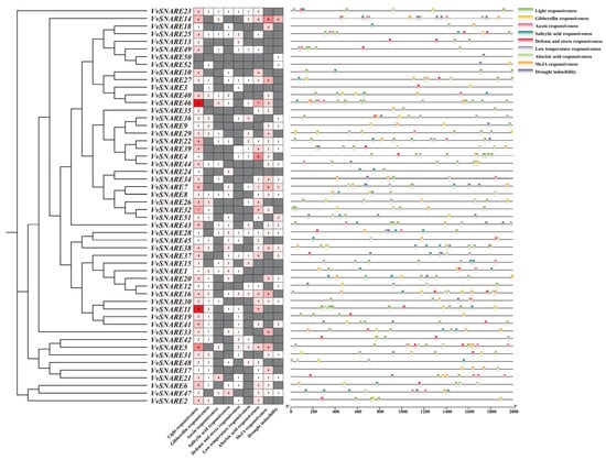 Cis-regulatory element analysis of the VvSNARE genes. Different colors on the right represent different elements. the numbers in the figure represent the number of cis acting elements.