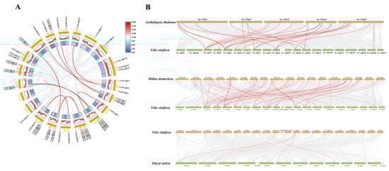 (A,B) Analysis of the collinear of the SNARE gene family in grapevines. (A) Collinearity analysis of VvSNARE. The gray lines represent all collinear blocks in the grape genome, and the red lines represent gene pairs between the VvSNARE genes. (B) Collinearity analysis of SNARE genes in grapevines and three representative plants. The gray lines in the background show collinearity between the V. vinifera and A. thaliana, M. domestica, and O. sativa genomes. The red lines show collinearity between A. thaliana and V. vinifera, M. domestica and V. vinifera, and Oryza sativa and V. vinifera for VvSNARE genes.