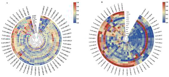 An analysis of the expression patterns of the VvSNARE gene family was conducted. Expression profiling revealed that a significant proportion (60%) of SNARE genes exhibited high expression levels in flesh and pollen. The remaining 41 VvSNARE genes exhibited lower expression levels in leaves, with the exception of VvSNARE3, VvSNARE44, VvSNARE30, VvSNARE23, VvSNARE48, VvSNARE37, VvSNARE33, VvSNARE41, VvSNARE45, VvSNARE43, and VvSNARE26. Notably, VvSNARE18, VvSNARE32, and VvSNARE7 exhibited exclusive high expression levels in pollen. VvSNARE11 showed high expression level in flesh, pericarp, pollen, and tendrils. High expressions of VvSNARE12 and VvSNARE16 were observed in seeds. VvSNARE30 had high expression levels in leaf tissues. Pollen exhibited high expression of VvSNARE49. In summary, the VvSNARE gene family displayed high expression levels in flesh, pollen, and pericarp while exhibiting lower expression in leaves (Figure 5B).