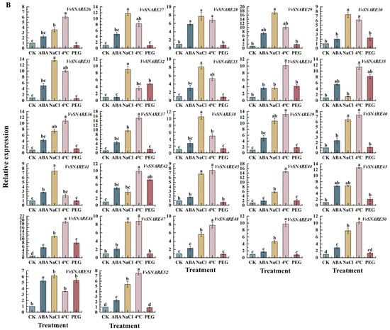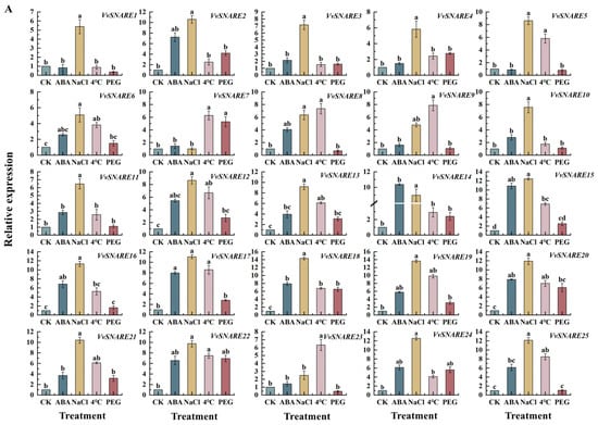 (A,B) Relative expression levels of SNARE genes in grape tissue under ABA, NaCl, 4 °C, and PEG treatments. Grape plantlets grown for 30 days were treated with 400 mmol·L−1 NaCl, 10% PEG and 0.2 mmol·L−1 ABA, respectively. The treatment time was 24 h. Distilled water was used as the control. Three biological and technical replicates were set up for this experiment. Gene expression was normalized to the unstressed control expression level, which was given the value of 1. Error bars represent the mean ± SE from three biological replicates. Different letters indicate significant differences, while the same lowercase letters indicate no statistical difference (p < 0.05).