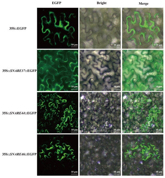 The subcellular localization of genes within cells significantly influences their functionality []. In previous study, it has been found that in A. thaliana, SNARE proteins are confined to the cell membranes, including the plasma membrane, endoplasmic reticulum membrane, and Golgi apparatus membrane []. Conversely, in O. sativa, they have been found to exist on membranes of multiple organelles, such as the plasma membrane, endoplasmic reticulum membrane, Golgi apparatus membrane, vesicle membrane, and cytoplasmic membrane []. The subcellular localization prediction revealed that the prevalent presence of SNARE genes in the cell membranes of grapevine cells, consistent with previous research findings. Furthermore, the tobacco transient transformation experiments confirmed the cell membrane localization of the VvSNARE37, VvSNARE44, and VvSNARE46 genes, validating the earlier predictions. However, there are differences in the subcellular distribution of SNARE gene family members between different species, possibly due to variations in growth and developmental conditions between species.