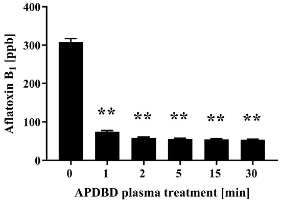 Quantitative measurement of aflatoxin B1 by ELISA after APDBD treatment. Dried spots of aflatoxin B1 were exposed to plasma for 0, 1, 2, 5, 15, and 30 min. The concentration of aflatoxin B1 in each sample was then determined by competitive ELISA. The concentration of aflatoxin B1 was quantified by comparison to a reference standard. Values were considered significantly different from the untreated sample (0 min) when verified by non-repeated measures analysis of variance (ANOVA), followed by a Tukey test (** p < 0.01).